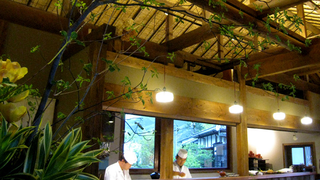わんちゃんとも入園出来る峰温泉大噴湯公園の吹き出す温泉塔のすぐ横の立地。湯けむりを眺められる、とてもロケーションの良いお店です。店内はアンティークな家具や食器でおもてなし。食材は地元素材にこだわり、新鮮な山の幸や海の幸満載のメニューです。